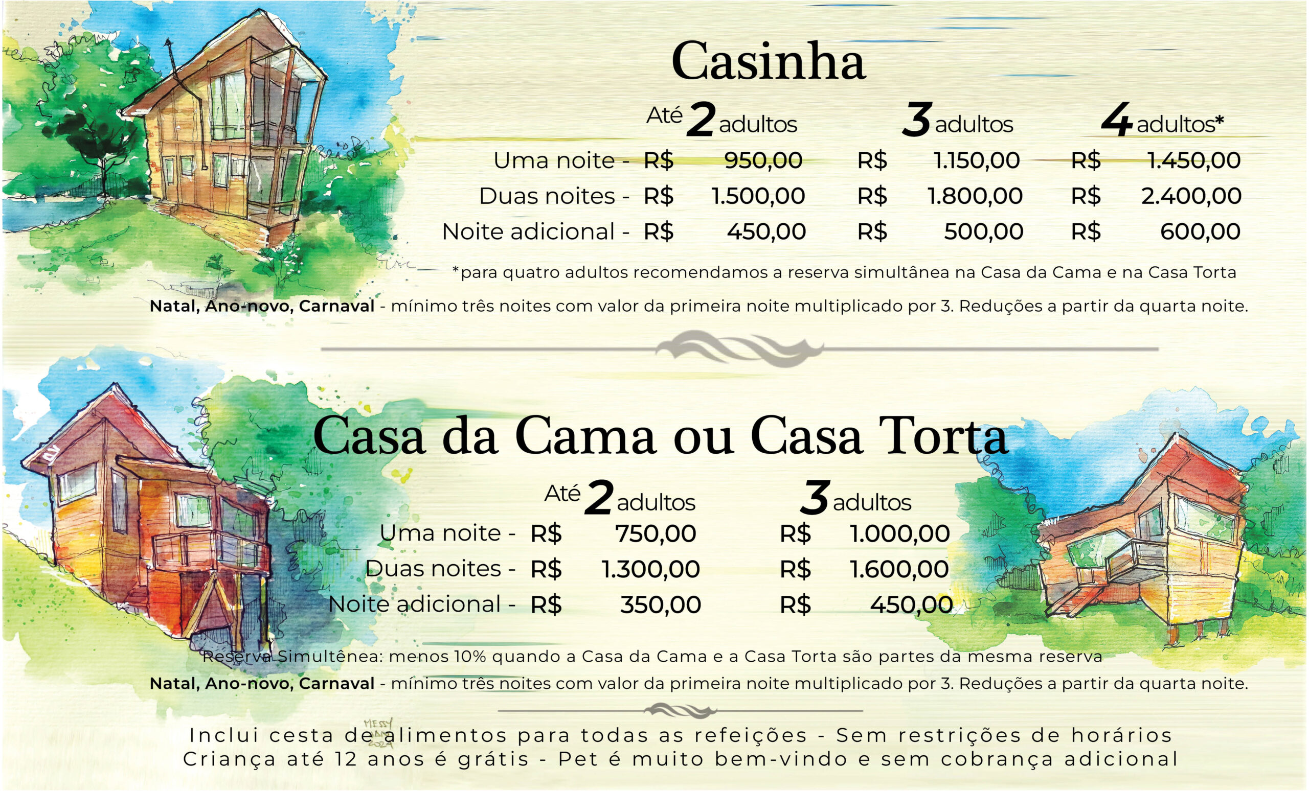 - Datas especiais – Natal, Ano Novo e Carnaval são os únicos períodos em que a tabela tem valores diferenciados e a permanência mínima ampliada.